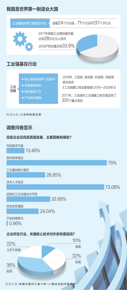 “要實現(xiàn)從‘有’到‘好’的轉(zhuǎn)變,在高端產(chǎn)品上突破,還需要時間?!闭{(diào)查中企業(yè)坦言,我國部分核心技術(shù)、關(guān)鍵產(chǎn)品和重大裝備仍存瓶頸制約,一些工業(yè)產(chǎn)品在一致性、穩(wěn)定性和使用壽命方面與國外先進水平差距較大,工業(yè)基礎(chǔ)須進一步夯實。