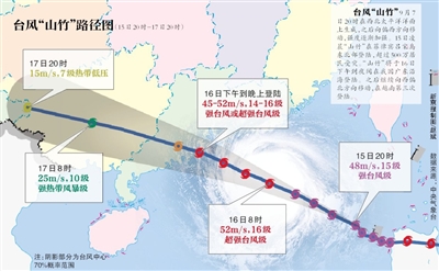 具體大風(fēng)預(yù)報顯示,15日20時至16日20時,南海中北部、臺灣海峽、巴士海峽、臺灣島及其沿海、瓊州海峽、北部灣東部、福建沿海、廣東沿海及廣東中南部、珠江口、香港、澳門、海南島東部和北部沿海將有7-10級大風(fēng),陣風(fēng)11-12級;其中南海北部、廣東大部沿海、珠江口、香港、澳門將有11-13級大風(fēng),陣風(fēng)14-15級,“山竹”中心經(jīng)過的附近海面或地區(qū)風(fēng)力可達(dá)14-16級,陣風(fēng)17級或17級以上。