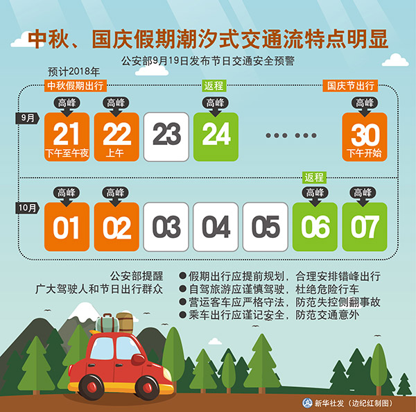 公安部分析近5年中秋、國慶期間道路交通事故規(guī)律特點(diǎn),對(duì)今年“兩節(jié)”期間道路交通安全形勢(shì)進(jìn)行了分析研判,預(yù)計(jì)今年中秋假期出行高峰為假期前一日(9月21日)下午至午夜及假期首日(9月22日)上午,返程高峰為假期最后一天(9月24日)。國慶節(jié)出行高峰從9月30日下午開始至10月2日,返程高峰在10月6日至7日。