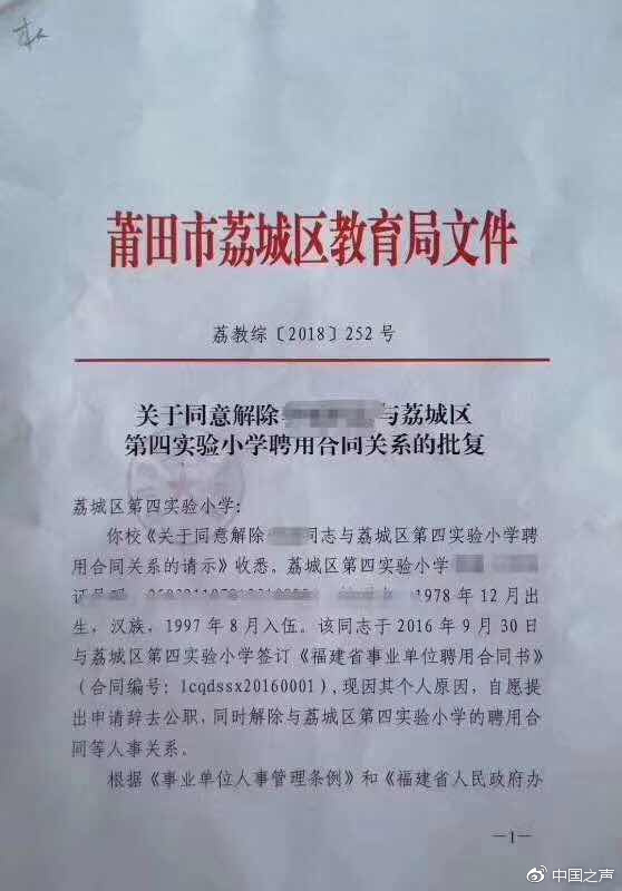 網(wǎng)上還流傳著一份落款為荔城區(qū)教育局9月19日的紅頭文件,該文件是發(fā)給荔城區(qū)第四實(shí)驗(yàn)小學(xué)的,主要內(nèi)容是因老師個(gè)人原因,自愿提出申請辭去公職,教育局批復(fù)同意解除這名教師和學(xué)校的人事關(guān)系。有家長因此將此文件和微信截圖聯(lián)系在一起,在朋友圈表示,微信截圖中的“廖老師”已經(jīng)被解職。