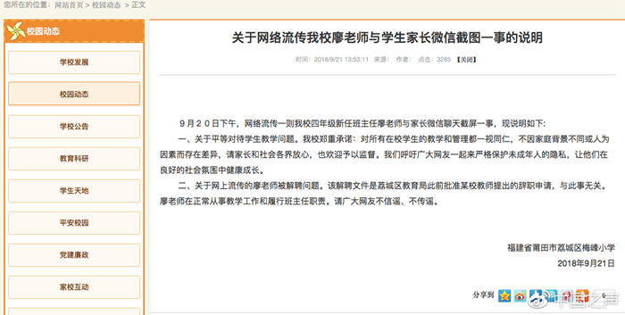 下午,涉事的莆田市荔城區(qū)梅峰小學(xué)在其官方網(wǎng)站發(fā)布消息,該解聘文件是荔城區(qū)教育局此前批準(zhǔn)某校教師提出的辭職申請,與此事無關(guān)。廖老師在正常從事教學(xué)工作和履行班主任職責(zé)。