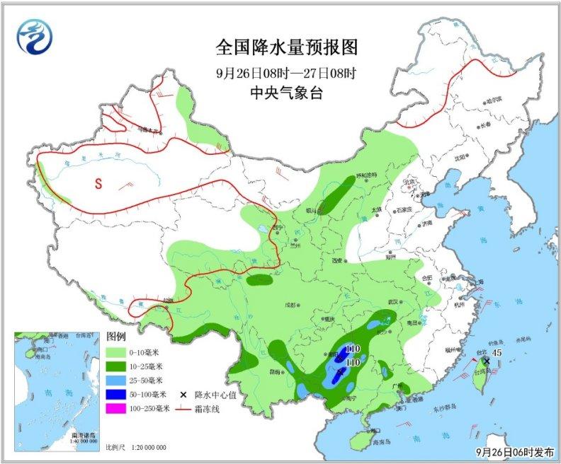 9月26日08時(shí)至27日08時(shí),西北地區(qū)中東部、內(nèi)蒙古中西部、華北北部、黃淮西部、江淮西部、江漢、江南中西部、華南、西南地區(qū)及臺(tái)灣島等地的部分地區(qū)有小到中雨,其中,貴州東南部、廣西西北部等地有大到暴雨,局地有大暴雨(100~110毫米);新疆北部、內(nèi)蒙古西部等地有4~6級(jí)風(fēng)(見圖1)。東海大部海域、臺(tái)灣海峽、臺(tái)灣以東洋面、巴士海峽、南海東北部海域?qū)⒂?~8級(jí)、陣風(fēng)9~10級(jí)的大風(fēng)。