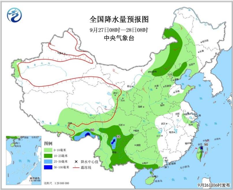 據(jù)中央氣象臺(tái)網(wǎng)站消息,9月26日至27日,西南地區(qū)和廣西等地局地有強(qiáng)降雨。9月26日至29日,冷空氣影響我國北方地區(qū),新疆局地氣溫將下降8~10℃。