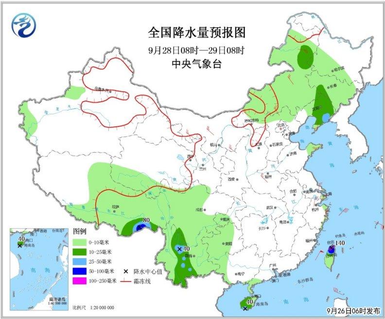 9月28日08時(shí)至29日08時(shí),內(nèi)蒙古中東部、東北地區(qū)中南部、西南地區(qū)西南部和海南島大部以及西藏中東部等地的部分地區(qū)有中到大雨,局地有暴雨或大暴雨(50~140毫米)(見圖3)。東海大部海域、臺(tái)灣海峽、臺(tái)灣以東洋面、南海東北部海域、巴士海峽將有7~8級(jí)、陣風(fēng)9~10級(jí)大風(fēng),其中東海東南部海域、臺(tái)灣以東洋面的部分海域風(fēng)力可達(dá)9~11級(jí)、陣風(fēng)12~13級(jí)。