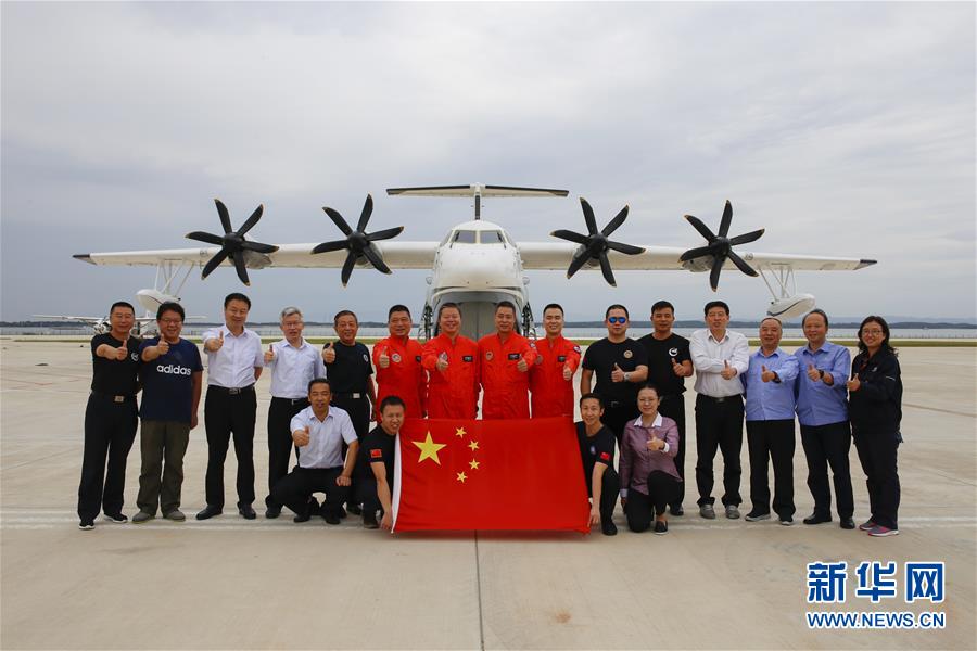 10月1日,AG600完成首次水上高速滑行試驗(yàn)后,機(jī)組成員及部分參研參試人員合影。 新華社發(fā)(中國航空工業(yè)集團(tuán)有限公司供圖)