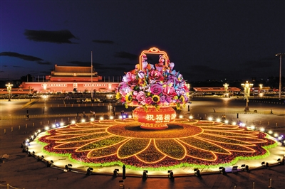 9月23日凌晨,天安門(mén)廣場(chǎng)高達(dá)17米的“祝福祖國(guó)”巨型花籃完工,正式與游客見(jiàn)面。除了天安門(mén)廣場(chǎng),長(zhǎng)安街沿線建國(guó)門(mén)至復(fù)興門(mén)的10處花壇,也為節(jié)日的北京增添喜慶。