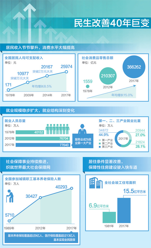 改革開放40年,是我國(guó)經(jīng)濟(jì)飛速發(fā)展、經(jīng)濟(jì)總量連上新臺(tái)階的40年,也是全體人民共享改革發(fā)展成果、生活水平大幅提高的40年。黨的十八大以來(lái),以習(xí)近平同志為核心的黨中央堅(jiān)持以人民為中心的發(fā)展思想,統(tǒng)籌做好就業(yè)、收入分配、社會(huì)保障、醫(yī)療衛(wèi)生等各領(lǐng)域民生工作,城鄉(xiāng)居民生活向全面小康社會(huì)更加扎實(shí)地邁進(jìn)。人民群眾的獲得感、幸福感、安全感更充實(shí)、更有保障、更可持續(xù)。