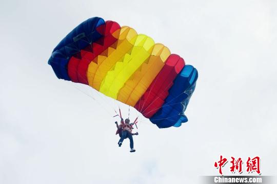 10月1日,石春艷和另兩名國家隊跳傘運動員在黃龍洞1500米高空同時攜帶五星紅旗進行了跳傘表演,共同祝福祖國繁榮昌盛。(通訊員 鄧道理 李遠明)