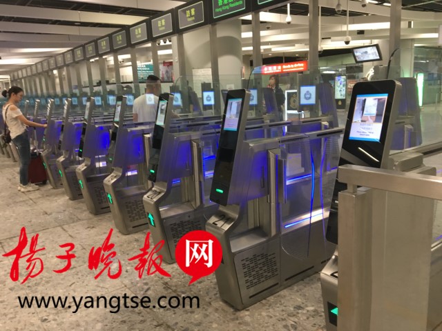 香港西九龍站實行“同層兩檢”。跨過這一條黃線就來到了香港口岸區(qū)。記者在進入香港入境待檢區(qū)域后,首先看到有三處設置體溫檢查的柜臺。再往里走,即是香港居民入境通道。一排閘機依次排開,港澳通行證放上即可通過。不過首次來港的旅客需要從人工柜臺入關。記者到達時,辦理香港入境程序的人較少,整個用時不到2分鐘,就完成辦理了入境程序。而在完成香港入境程序后,即可到檢票閘機處刷票出閘。從下車到入關,記者一共花了約15分鐘。“現(xiàn)在正是小長假,如果沒有坐高鐵而是選擇從福田口岸過關,1個小時都搞不定?!币晃桓L镉慰透嬖V記者。