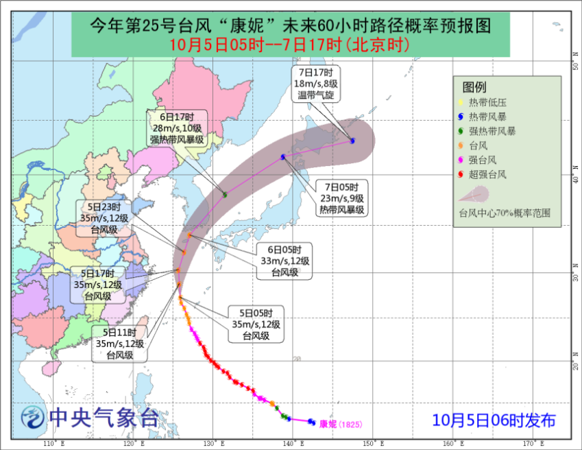 受“康妮”和冷空氣的共同影響,我國東部海域?qū)⒂休^大風(fēng)雨,其中5日08時(shí)到6日08時(shí),黃海南部、東海、臺灣東北洋面、浙江東部及沿海、上海沿海、江蘇沿海、杭州灣、長江口區(qū)將有7-10級大風(fēng),其中東海大部、黃海東南部的風(fēng)力可達(dá)11級,“康妮”中心經(jīng)過的東海東北部部分海域風(fēng)力可達(dá)12級,陣風(fēng)13-14級,浙江東北部、上海東部局地有中到大雨。為此,中央氣象臺10月5日06時(shí)繼續(xù)發(fā)布臺風(fēng)藍(lán)色預(yù)警。