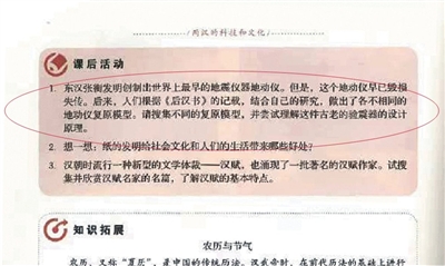 10月9日,多家媒體報(bào)道稱,2017年秋天投入使用的統(tǒng)編本初中歷史教科書七年級上冊中,關(guān)于張衡地動儀的內(nèi)容被刪除。據(jù)報(bào)道,張衡地動儀被刪除,是因?yàn)橛袑<艺J(rèn)為其模型一直存有疑問,并向相關(guān)教育部門進(jìn)行反映。