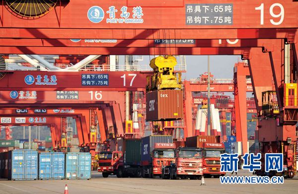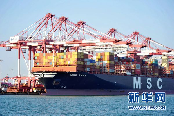10月12日,集裝箱班輪在山東青島港外貿(mào)集裝箱碼頭裝卸集裝箱。新華社發(fā)(俞方平 攝)