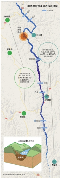 據(jù)范曉介紹,金沙江堰塞湖的山體滑坡處在西藏的峽谷一帶,地差比較大,兩岸陡峭,且因巖石構(gòu)造原因,該地帶是山體滑坡崩塌高發(fā)地。而這次金沙江堰塞湖的形成,主要是滑坡土量達約2500萬立方米,進而把河道堵塞形成堰塞體,堰塞體堵截河道形成堰塞湖。