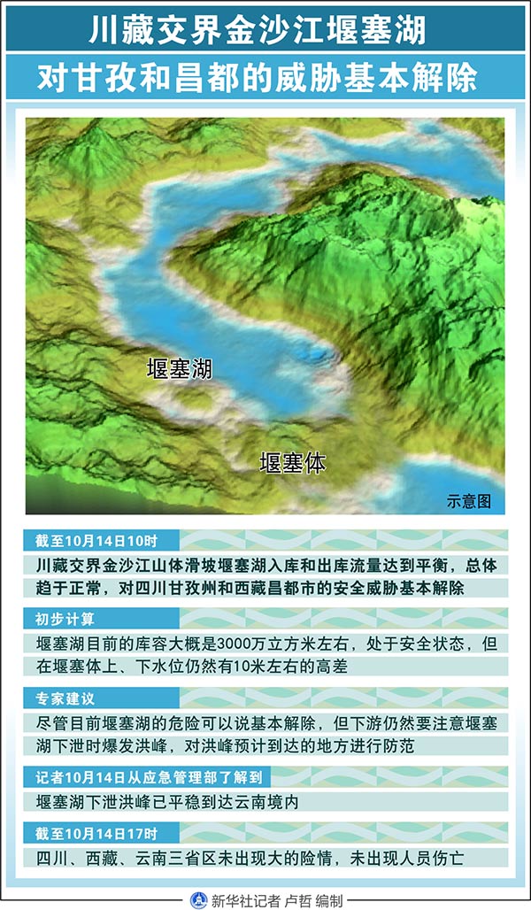 新華社成都10月14日電(記者 薛文獻(xiàn)、春拉)截至14日10時(shí),川藏交界金沙江山體滑坡堰塞湖入庫(kù)和出庫(kù)流量達(dá)到平衡,總體趨于正常,對(duì)四川甘孜州和西藏昌都市的安全威脅基本解除。
