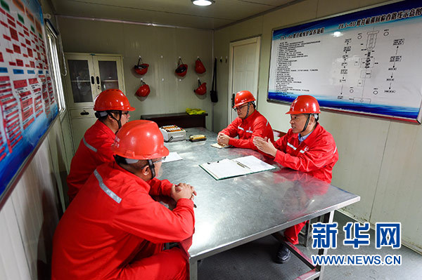 田明(右一)與團(tuán)隊(duì)工作人員在江蘇真武油田井場研究設(shè)備作業(yè)運(yùn)轉(zhuǎn)情況(10月9日攝)。新華社記者 李博 攝