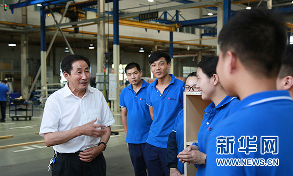 吳振祥(左)走進(jìn)企業(yè)車(chē)間班組,與職工面對(duì)面交談(資料照片)。 新華社發(fā)
