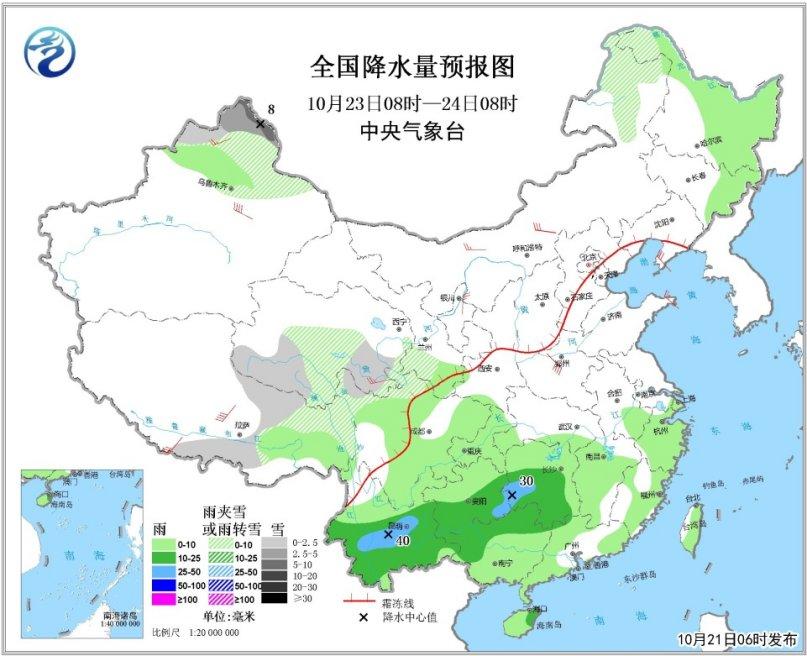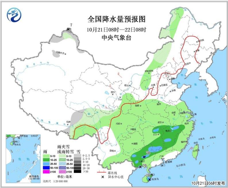 10月21日08時至22日08時,新疆塔城和阿勒泰地區(qū)、內蒙古東部、青海南部、西藏東部、川西高原北部等地的部分地區(qū)有小到中雪或雨夾雪,其中阿勒泰北部局地有大雪。江南中西部、華南西部和北部、海南島中東部等地有中到大雨,其中廣西中部和南部沿海、海南島東南部等地的局部地區(qū)有暴雨(50~70毫米)。內蒙古西部、甘肅中部有4~5級偏北風(見圖1)。