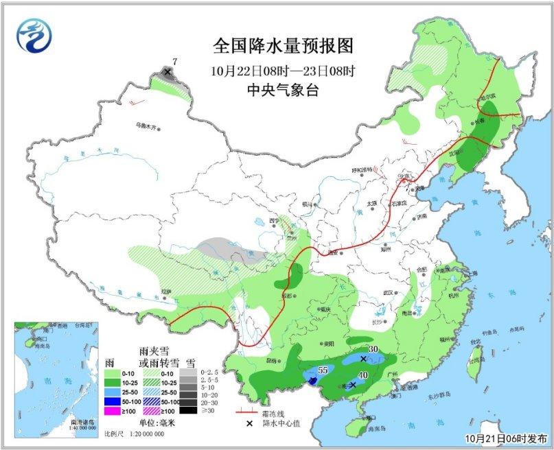 10月22日08時至23日08時,新疆阿勒泰地區(qū)、內蒙古東北部、西藏東部、青海南部、甘肅中部、川西高原北部等地部分地區(qū)有小雪或雨夾雪,其中,阿勒泰北部局地有大雪(5~7毫米)。吉林東部、遼寧東部、云南東部、四川盆地西北部、廣西大部和廣東西部等地部分地區(qū)有中到大雨,其中,云南東南部和廣西西南部等地的局部地區(qū)有暴雨(50~55毫米)。新疆北部、甘肅中部、內蒙古中東部和遼寧中部等地部分地區(qū)有4~6級風(見圖2)。