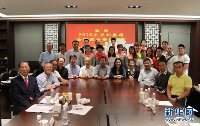 2016年,里約奧運會大陸金牌選手和教練交流團到“中華兩岸經(jīng)貿(mào)投資文化教育協(xié)會”座談交流時合影。協(xié)會由黃紫玉(前排右五)在2009年發(fā)起成立,成為兩岸民間交流的一個平臺(受訪者供圖)。 新華社發(fā)
