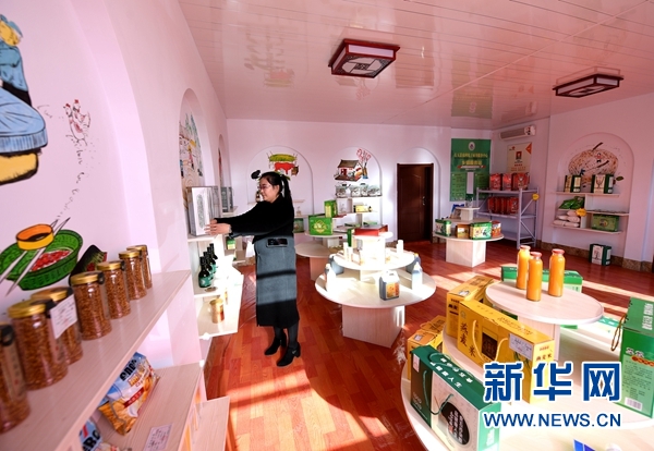 在山西省右玉縣殺虎口村,村民王彩霞在殺虎口村生態(tài)旅游專(zhuān)業(yè)合作社內(nèi)整理當(dāng)?shù)靥禺a(chǎn)(10月25日攝)。新華社記者 楊晨光攝
