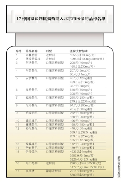 考慮到文件印發(fā)后,各定點(diǎn)醫(yī)療機(jī)構(gòu)還需開展藥品采購、配備以及進(jìn)行醫(yī)院的信息系統(tǒng)升級改造等因素,這17種抗癌藥北京市將從今年11月15日起開始納入醫(yī)保報銷。