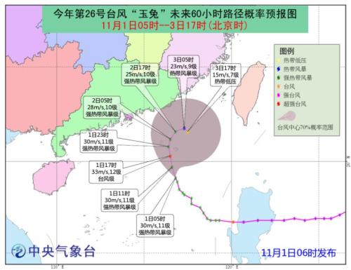 受“玉兔”和冷空氣共同影響,11月 1日08時到11月2日08時,廣東東部、福建中南部沿海、臺灣東部和南部等地將有大雨,局地有暴雨或大暴雨(50~110毫米)。東海南部偏南海域、臺灣以東洋面、巴士海峽、南海中東部偏北海域和南海西北部偏東海域及臺灣沿海將有7~8級大風(fēng),陣風(fēng)9~10級;臺灣海峽、福建沿海、廣東東部沿海、南海東北部大部海域風(fēng)力達9~10級,陣風(fēng)11~12級;“玉兔”中心經(jīng)過的南海東北部的部分海域或地區(qū)的風(fēng)力可達11~12級,陣風(fēng)13~14級(見圖2)。