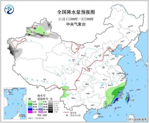 11月1日08時至2日08時,新疆北部和南疆西部山區(qū)等地部分地區(qū)有中到大雪或雨夾雪,局地有暴雪(10~15毫米)。江南東部、廣東中東部和臺灣島東北部等地的部分地區(qū)有中到大雨,其中,廣東東部、福建南部和臺灣等地局地有暴雨或大暴雨(100~110毫米)。新疆北部、南疆盆地、內(nèi)蒙古西部和甘肅西部等地的部分地區(qū)有5~6級及以上風(fēng)。臺灣海峽、南海東北部海域?qū)⒂?~9級大風(fēng),陣風(fēng)10~11級(見圖3)。
