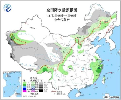 11月3日08時至4日08時,內(nèi)蒙古東部、黑龍江中西部、吉林西部、南疆西部和南部山區(qū)、青海西南部和東北部、西藏北部和東部、川西高原北部等地部分地區(qū)有小到中雪或雨夾雪,其中,南疆西部山區(qū)和西藏西部的部分地區(qū)有大雪,局地暴雪(10~15毫米)。內(nèi)蒙古東南部、黑龍江南部、吉林中部、江淮中南部、江南中東部、四川盆地西南部、甘肅東南部、南疆盆地、西藏東南部等地的部分地區(qū)有小到中雨,局地有大雨(25~30毫米)。內(nèi)蒙古西部和新疆伊犁河谷等地部分地區(qū)有4~6級及以上風(fēng)(見圖5)。東海南部海域?qū)⒂?~8級、陣風(fēng)9級的大風(fēng),東海北部海域、臺灣海峽、南海東北部海域?qū)⒂?~7級、陣風(fēng)8級的大風(fēng)。