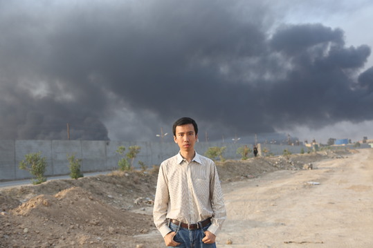 2016年11月10日劉萬利在伊拉克摩蘇爾市南部地區(qū)采訪。