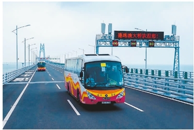 大巴車經(jīng)過港珠澳大橋青州航道橋附近。中新社記者 張煒 攝
