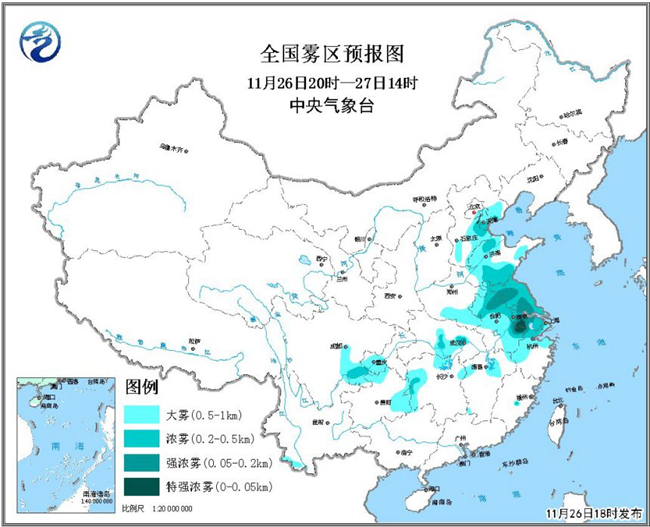 馬學(xué)款:根據(jù)實況監(jiān)測數(shù)據(jù),11月26日早上,河北中南部、北京東南部、天津、山東中西部、河南中東部、安徽中北部等地出現(xiàn)濃霧或中到重度霾;河北、河南、山東、安徽等地部分地區(qū)有能見度不足50米的特強(qiáng)濃霧。26日晚上起,受冷空氣影響,華北平原大霧逐漸減弱或消散。