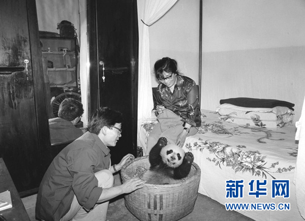 新華社記者金勖琪1984年拍攝的四川平武縣林業(yè)局的助理工程師鐘肇敏(左)一家把一頭受病餓威脅的熊貓幼仔“龍龍”收留在家里精心喂養(yǎng)。新華社記者 張超群 攝