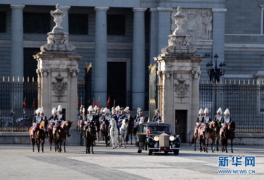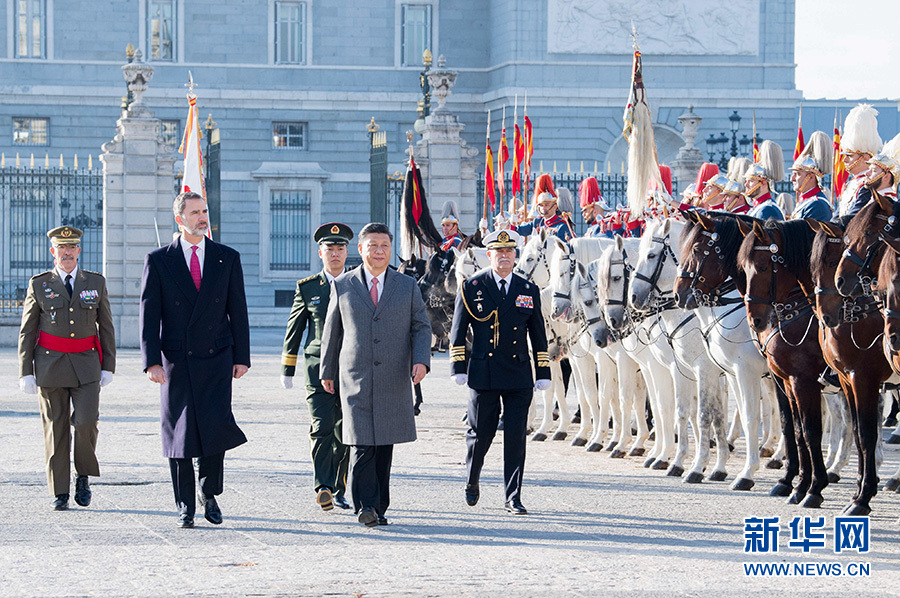 習(xí)近平和夫人彭麗媛乘皇家禮車在身著禮服、騎著高頭大馬的西班牙皇家衛(wèi)隊(duì)騎兵護(hù)衛(wèi)下,前往武器廣場(chǎng)。抵達(dá)時(shí),鼓樂(lè)齊鳴,費(fèi)利佩六世國(guó)王和萊蒂西婭王后上前迎接,互致問(wèn)候。費(fèi)利佩六世向習(xí)近平介紹王室高級(jí)官員。隨后,兩國(guó)元首夫婦一同登上檢閱臺(tái)。在21響禮炮聲中,軍樂(lè)團(tuán)奏中國(guó)、西班牙兩國(guó)國(guó)歌。儀仗隊(duì)長(zhǎng)趨前請(qǐng)習(xí)近平檢閱。習(xí)近平在費(fèi)利佩六世國(guó)王陪同下依次檢閱步兵方隊(duì)、騎兵方隊(duì)和摩托車隊(duì)。習(xí)近平同西方陪同人員握手,費(fèi)利佩六世國(guó)王同中方陪同人員握手。兩國(guó)元首夫婦返回檢閱臺(tái),觀看分列式。在摩托車隊(duì)引領(lǐng)下,整齊的軍樂(lè)隊(duì)、雄赳赳的步兵方隊(duì)、威武的騎兵方隊(duì)依次通過(guò)檢閱臺(tái)。