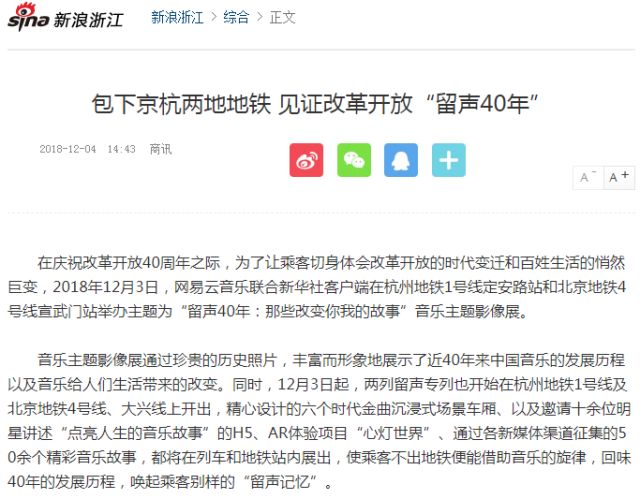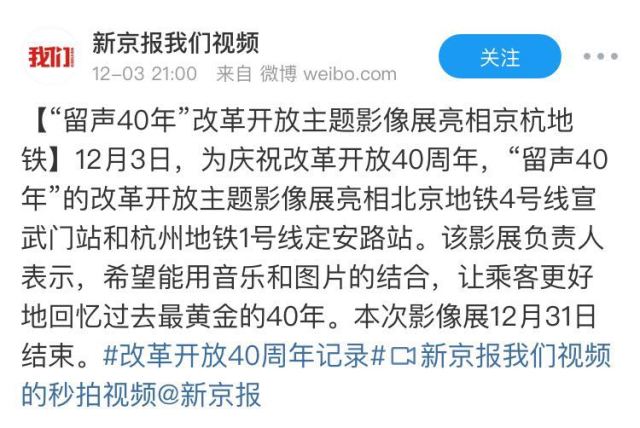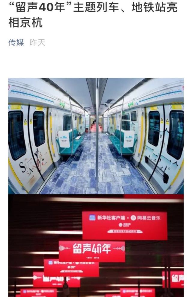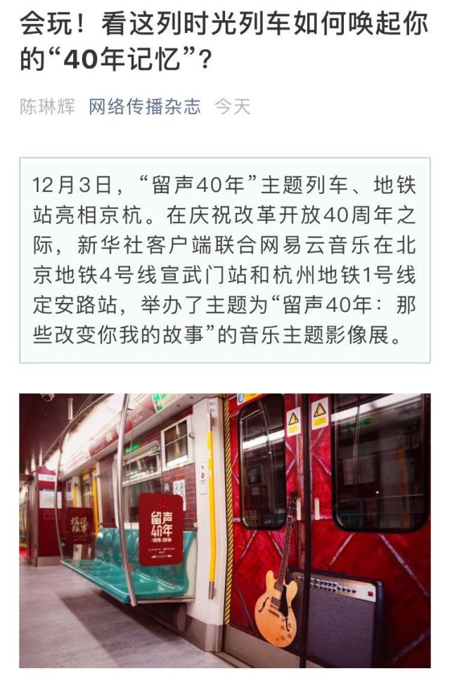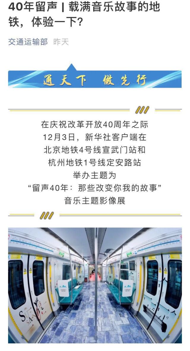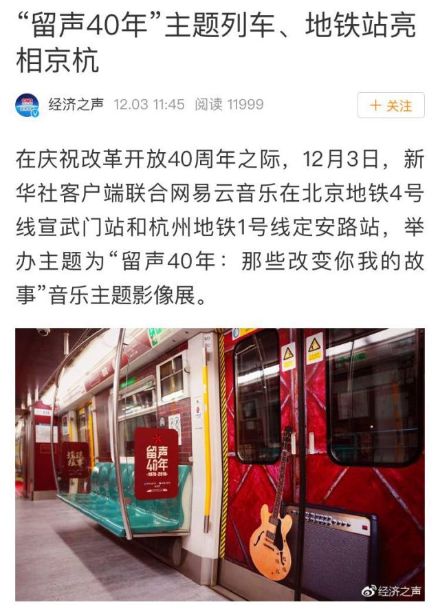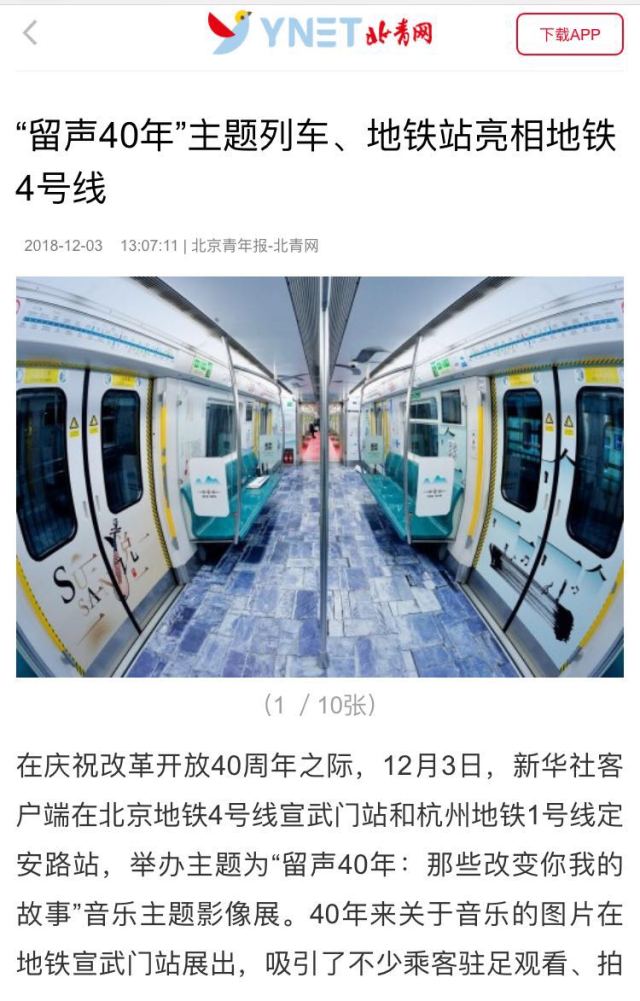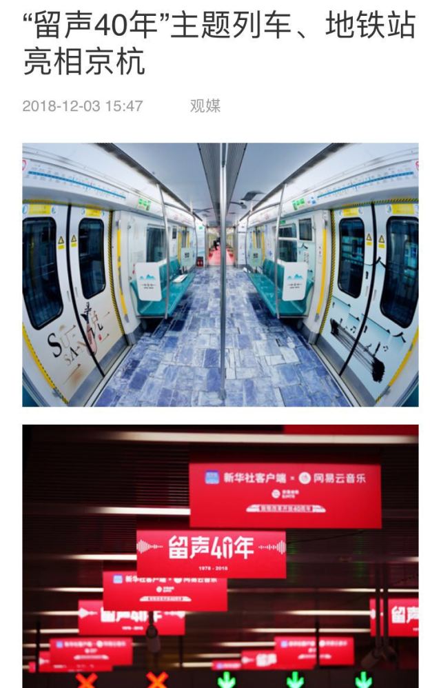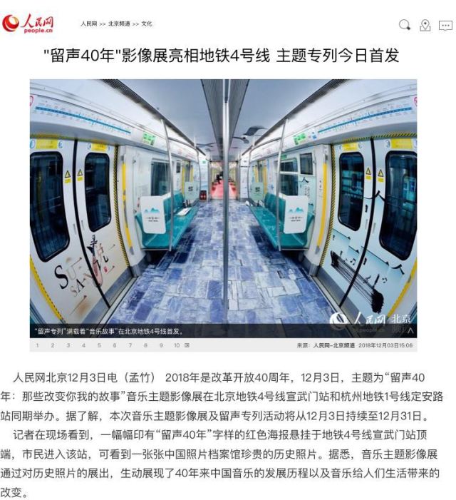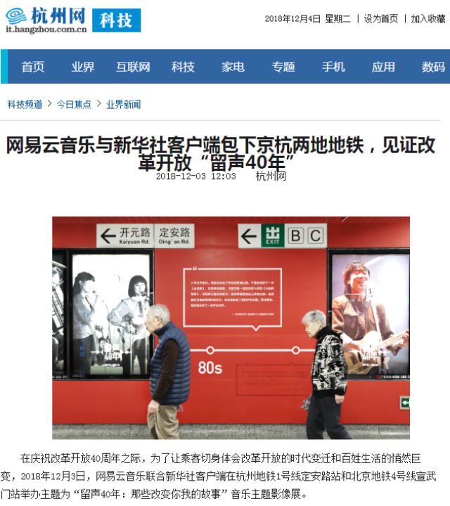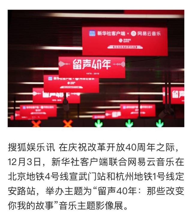 新華社北京12月4日電(記者 牧小湘)為慶祝改革開(kāi)放40周年,新華社客戶端與網(wǎng)易云音樂(lè)、京港地鐵聯(lián)合舉辦的“留聲40年:那些改變你我的故事”音樂(lè)主題影像展12月3日亮相北京地鐵4號(hào)線宣武門站及杭州地鐵1號(hào)線定安路站。