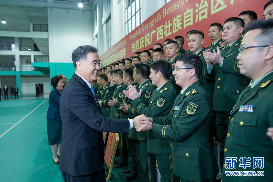 在慰問(wèn)廣西軍區(qū)和駐桂部隊(duì)官兵代表時(shí),汪洋指出,廣西是英雄的省份,是紅色的熱土。老一輩革命家在這里書(shū)寫(xiě)了中國(guó)革命史上光輝一頁(yè)。廣西軍區(qū)建立以來(lái),一茬接一茬官兵在這里保家衛(wèi)國(guó)、無(wú)私奉獻(xiàn),為實(shí)現(xiàn)祖國(guó)邊疆安寧、人民幸福安康作出了重大貢獻(xiàn)。你們付出的艱辛努力,取得的光輝業(yè)績(jī),黨和政府不會(huì)忘記,人民不會(huì)忘記。