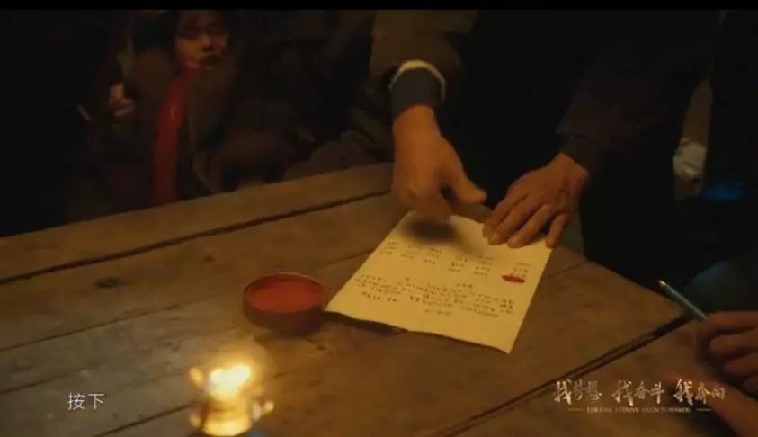 小崗村的變革,有多少人是通過那幅油畫了解到當(dāng)時(shí)的場(chǎng)景的,這一次我們讓油畫“動(dòng)了”起來。在畫面中,所有演員的站位,包括后來進(jìn)來的劉燁,都精準(zhǔn)地參照并還原了小崗村油畫的畫面。變身農(nóng)民的劉燁提著馬燈偷偷進(jìn)入屋內(nèi),詢問過后,率先在責(zé)任書上按下手印,畫面中的責(zé)任書是以博物館中保存的原版責(zé)任書為參考,完全臨摹后制作的道具,整個(gè)道具細(xì)致到了每一位農(nóng)民按手印的位置。