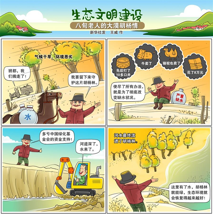 班都老人先后賣掉了8頭牛、3匹駱駝,打了10多口井,花了8萬多元疏通被風(fēng)沙掩埋的河道……引水、蓄水,他使盡所有,只為徹底改變?nèi)彼疇顩r。
