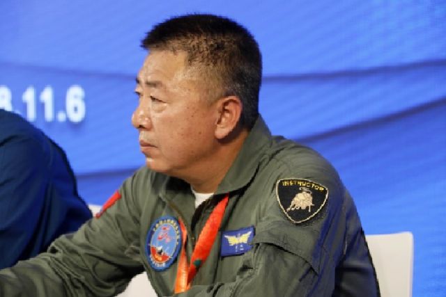 ↑殲-20首飛試飛員李剛在記者見(jiàn)面會(huì)上