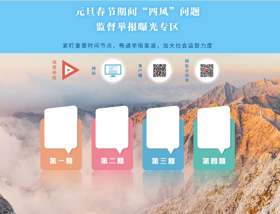 2019年元旦、春節(jié)將至,為切實抓好節(jié)日期間落實中央八項規(guī)定及其實施細(xì)則精神、糾正“四風(fēng)”工作,營造風(fēng)清氣正節(jié)日氛圍,中央紀(jì)委國家監(jiān)委網(wǎng)站推出“元旦春節(jié)期間‘四風(fēng)’問題監(jiān)督舉報曝光專區(qū)”,暢通監(jiān)督舉報渠道,加大典型案例通報曝光力度,增強警示震懾和教育引導(dǎo)作用。