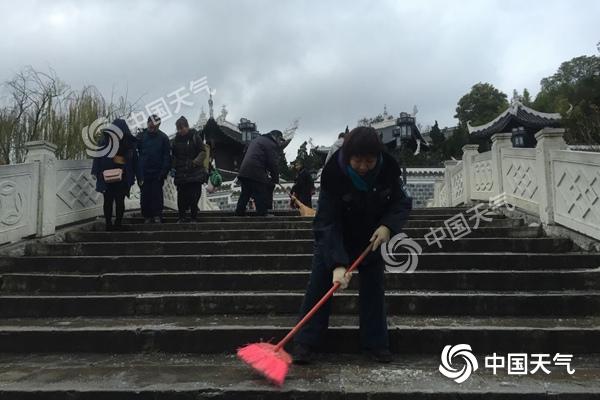 昨天上午,貴陽甲秀樓景區(qū)工作人員正在清掃浮玉橋上的結冰。(楊春竹 攝)