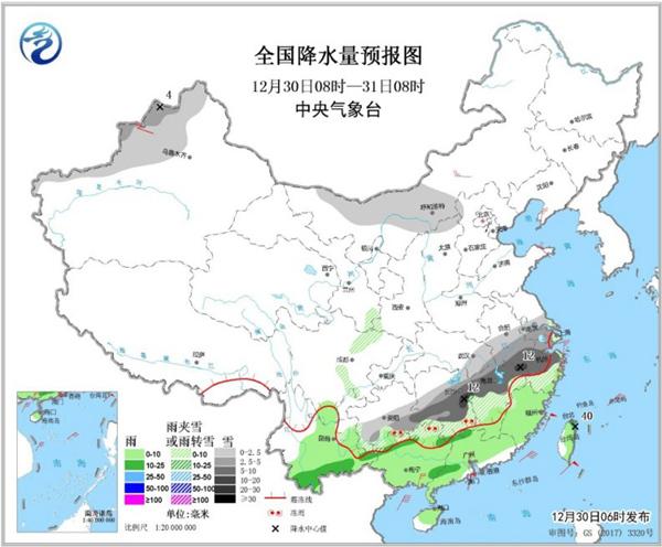 中央氣象臺預計,今天內(nèi)蒙古西部、新疆北部、江淮中南部、江漢東部、江南中北部、西南地區(qū)東南部等地部分地區(qū)有小到中雪或雨夾雪,其中,貴州東南部、湖南中部、江西北部、安徽南部、浙江中北部等地有大雪,湖南東部、江西西部和東北部、安徽南部、浙江西部等地局地有暴雪(10~12毫米)。江南南部、西南地區(qū)南部、華南大部和臺灣島大部等地部分地區(qū)有小到中雨,其中,臺灣島東北部局地有大雨(25~40毫米)。