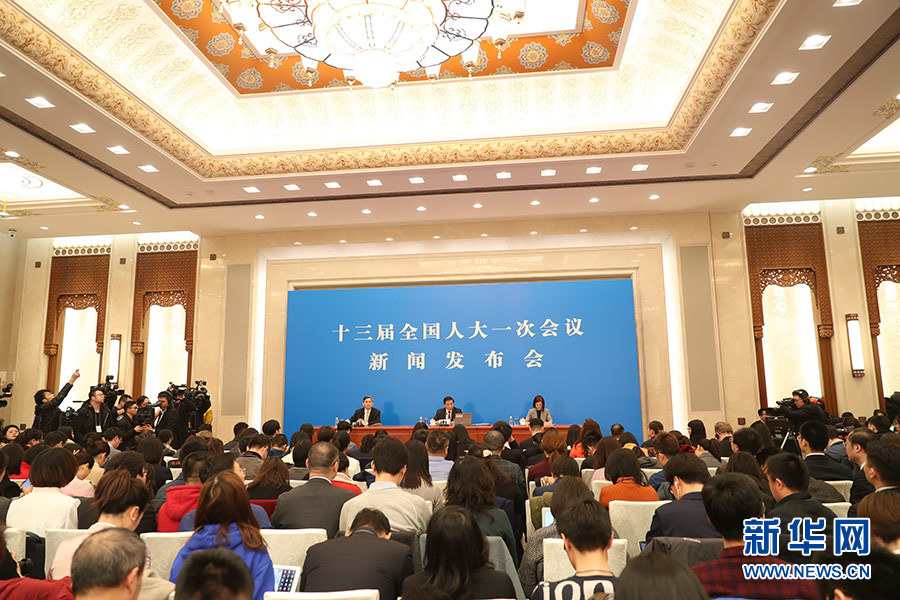 3月4日,十三屆全國人大一次會議在人民大會堂新聞發(fā)布廳舉行新聞發(fā)布會,由大會發(fā)言人張業(yè)遂就大會議程和人大工作相關的問題回答中外記者的提問。圖為新聞發(fā)布會現(xiàn)場。新華網(wǎng)/中國政府網(wǎng) 陳杰 攝