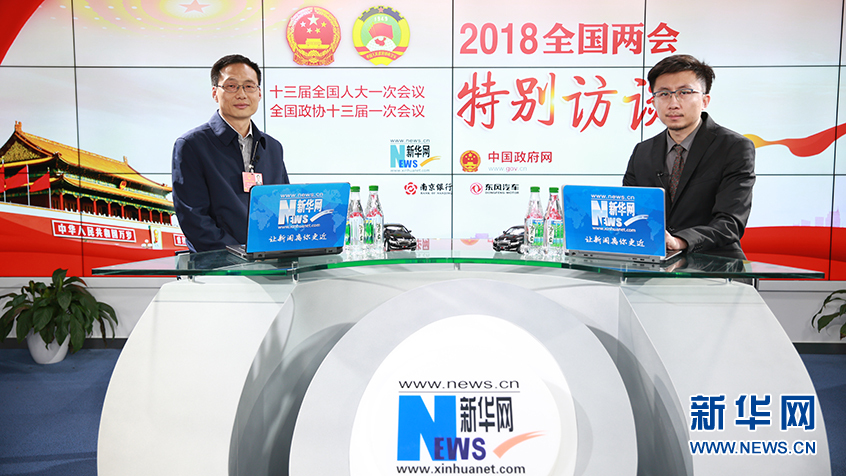 3月6日,全國(guó)人大代表、湖北省荊州市市長(zhǎng)崔永輝(左)做客新華網(wǎng)2018全國(guó)兩會(huì)特別訪談。新華網(wǎng) 楊锘攝