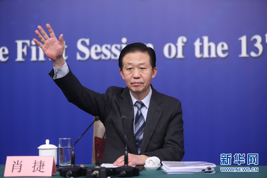 十三屆全國人大一次會議新聞中心于3月7日上午在梅地亞中心多功能廳舉行記者會,邀請財政部部長肖捷,副部長史耀斌、胡靜林就“財稅改革和財政工作”相關(guān)問題回答中外記者提問。圖為財政部部長肖捷向記者舉手示意。新華網(wǎng)/中國政府網(wǎng)?翟子赫 攝