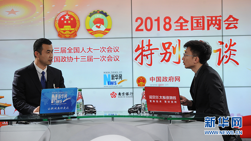 3月9日,全國人大代表、遼寧三溝酒業(yè)有限責(zé)任公司董事長(zhǎng)吳京耕(左)做客新華網(wǎng)2018全國兩會(huì)特別訪談。新華網(wǎng)?郭小天攝
