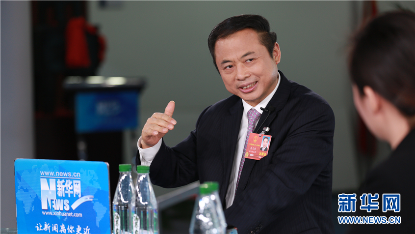 3月9日,全國人大代表,全國工商聯(lián)執(zhí)委、浙江省工商聯(lián)副主席、天能集團董事長張?zhí)烊巫隹托氯A網(wǎng)2018全國兩會特別訪談。新華網(wǎng) 楊锘攝
