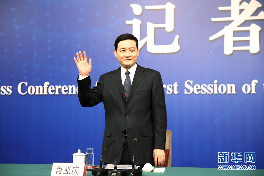 十三屆全國人大一次會議新聞中心3月10日15時(shí)在梅地亞中心多功能廳舉行記者會,邀請國務(wù)院國資委主任肖亞慶,副秘書長、新聞發(fā)言人彭華崗就“國有企業(yè)改革發(fā)展”相關(guān)問題回答中外記者提問。圖為肖亞慶向記者示意。新華網(wǎng)/中國政府網(wǎng) 翟子赫 攝