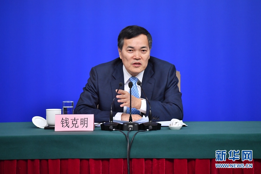 3月11日,十三屆全國(guó)人大一次會(huì)議新聞中心舉行記者會(huì),邀請(qǐng)商務(wù)部部長(zhǎng)鐘山、副部長(zhǎng)兼國(guó)際貿(mào)易談判副代表王受文、副部長(zhǎng)錢(qián)克明就“推動(dòng)形成全面開(kāi)放新格局推動(dòng)商務(wù)事業(yè)高質(zhì)量發(fā)展”相關(guān)問(wèn)題回答中外記者提問(wèn)。這是錢(qián)克明在回答記者提問(wèn)。 新華社記者 李鑫 攝