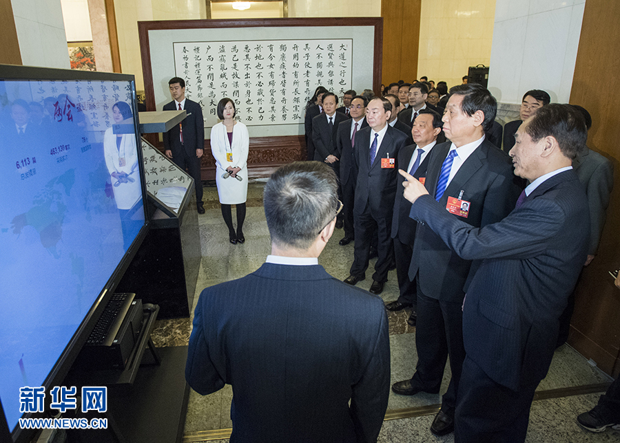 隨后,栗戰(zhàn)書走進設(shè)在人民大會堂一樓大廳的新華社兩會新聞報道中心,仔細(xì)觀看了微視頻《誓言》、人工智能產(chǎn)品《“媒體大腦”帶你看憲法宣誓》、新華社兩會報道實時大數(shù)據(jù)展示、新華網(wǎng)“奮進新時代 筑夢新征程”兩會融媒體專題等,看望正在這里緊張工作的采編和技術(shù)人員,與參加兩會報道的新華社外籍記者親切交談。在觀看了新華社制作的融媒體產(chǎn)品《“90后”全國人大代表程桔:小丫回村當(dāng)書記》后,栗戰(zhàn)書對新聞媒體創(chuàng)新兩會報道給予充分肯定。