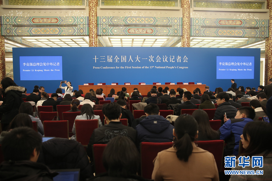 3月20日上午,十三屆全國(guó)人大一次會(huì)議閉幕后,國(guó)務(wù)院總理李克強(qiáng)將在人民大會(huì)堂三樓金色大廳會(huì)見(jiàn)采訪十三屆全國(guó)人大一次會(huì)議的中外記者并回答記者提出的問(wèn)題。圖為記者會(huì)現(xiàn)場(chǎng)。 新華網(wǎng)/中國(guó)政府網(wǎng) 翟子赫 攝